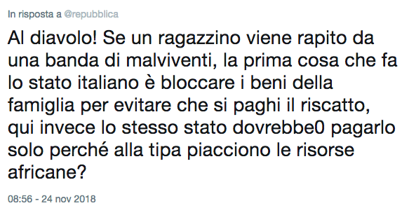 Al diavolo! Se un ragazzino viene rapito da una banda di malviventi, la prima cosa che fa lo stato italiano è bloccare i beni della famiglia per evitare che si paghi il riscatto, qui invece lo stesso stato dovrebbe0 pagarlo solo perché alla tipa piacciono le risorse africane?