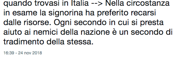 quando trovasi in Italia –> Nella circostanza in esame la signorina ha preferito recarsi dalle risorse. Ogni secondo in cui si presta aiuto ai nemici della nazione è un secondo di tradimento della stessa.