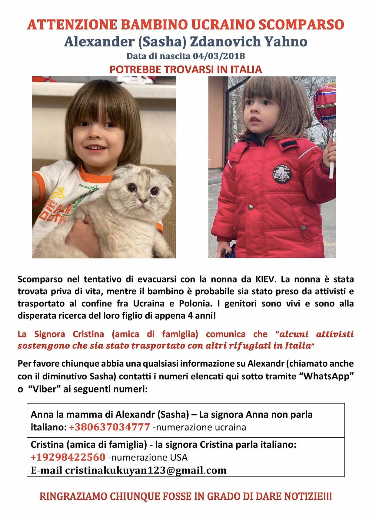 I nostri lettori ci segnalano l’appello per un bambino ucraino scomparso. Si tratta di Alexander “Sasha” Zdanovich Yahno, 4 anni, e la sua storia è tristemente collegata al conflitto in Ucraina. Secondo un manifesto divenuto virale sui social, il piccolo risulta scomparso dal 10 marzo 2022 mentre era in fuga da Kiev.