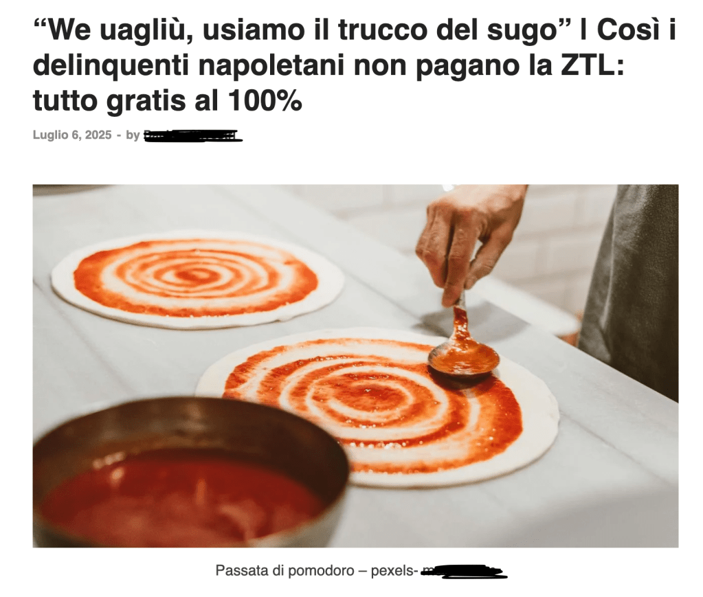In questo caso l’articolo inventa un’emergenza degna di una gag di Totò o dell’Italiano stereotipato alla “Mario e Luigi”: orde di Napoletani armati di sugo della Pizza (!!!) che aspergono le targhe dello stesso diventando invisibili alla ZTL.