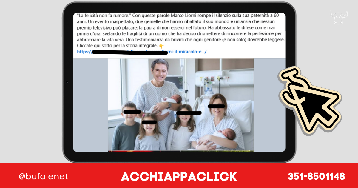 L’assurdo fotoromanzo social di Marco Liorni padre a 60 anni fa parte di un ricco filone di storielle inventate che riguardano svariati personaggi famosi. Solitamente vengono accompagnate da testi con AI e immagini generate: in questo caso si va “low tech” con una foto nella quale la faccia del conduttore è malamente sovrapposta al corpo di un padre ritratto con una pletora di bambini.
