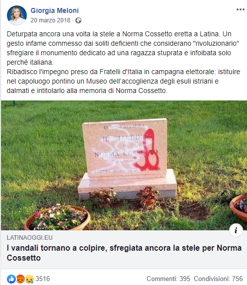 Giorgia Meloni allegava un articolo pubblicato su Latina Oggi il 20 marzo 2018. La stele dedicata a Norma Cossetto era stata inaugurata il 9 febbraio 2018 tra via Cimarosa e via Banchieri, in una zona verde definita “Il giardino di Norma Cossetto”. Gli articoli parlavano di “secondo episodio” in quanto già dall’11 febbraio 2018, pochissimi giorni dopo l’inaugurazione, la stele era stata vandalizzata con una “A” anarchica di vernice rossa.
