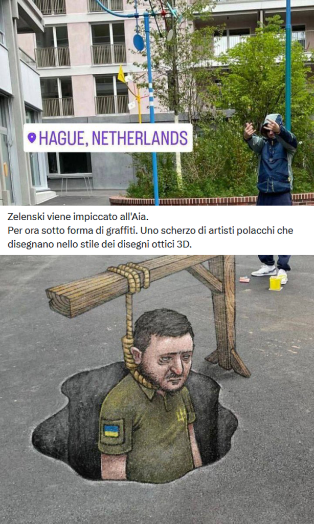 Combo di falsi per le fonti russe: madonnari che non esistono dipingono graffiti che non esistono con Zelensky impiccato a L’Aia. Ci sarebbe molto da studiare su tale carnascialesca esibizione di odio filorusso e cosa spinga le fonti russe a inventarsi un gruppo di finti madonnari in giro per il mondo.