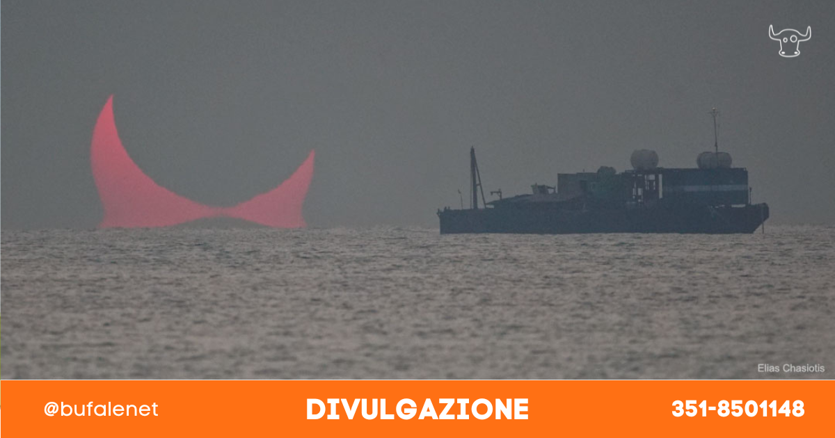 L’eclisse solare ha invece contribuito a creare l’immagine di un Sole parzialmente coperto dalla Luna: due Soli ridotti a due “lunette” si sono incrociati quindi creando una specie di figura cornuta rossa che sorge dal mare.