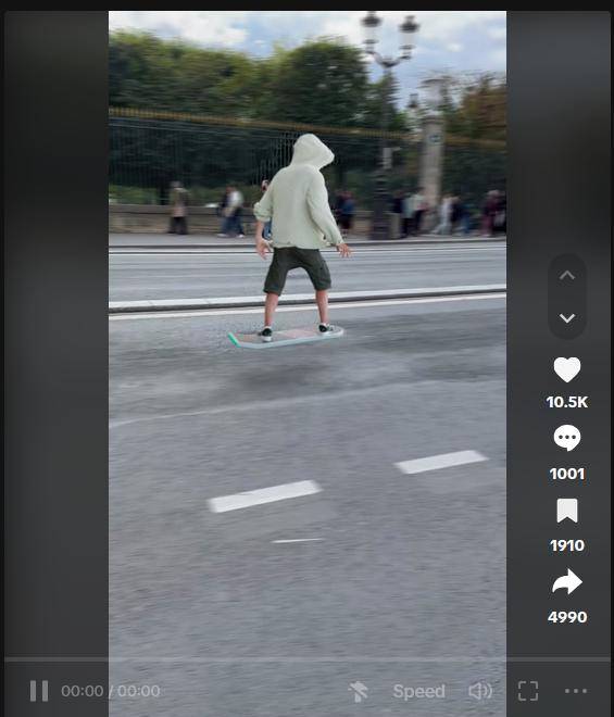 Ci avete segnalato un video su TikTok con scene raffiguranti l’hoverboard di Ritorno al Futuro a Parigi, come nella saga di film. Ci tocca rivelarvi che non siete stati attenti: se aveste guardato l’intestazione del video ne avreste visto l’autore.