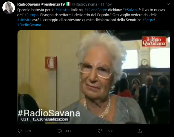 Epocale batosta per la #sinistra italiana, #LilianaSegre dichiara: “#Salvini è il volto nuovo dell’#Europa. Bisogna rispettare il desiderio del Popolo.” Ora voglio vedere chi della #sinistra avrà il coraggio di contestare queste dichiarazioni della Senatrice #Segre! #RadioSavana