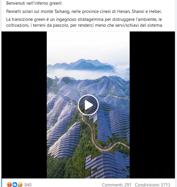 Ci segnalano i nostri contatti un post Facebook che descrive i pannelli solari a Taihan, Cina, come un “incubo green” per distuggere l’ambiente, le coltivazioni e i terreni da pascolo