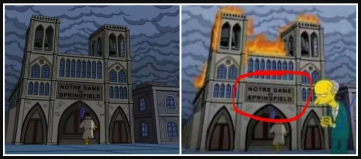 Nel famoso cartone, la cattedrale di Notre Dame appare almeno una volta, ma non quando è in fiamme. L’immagine con l’incendio è stata infatti modificata digitalmente. L’originale non mostrava la chiesa in fiamme, né il signor Burns in piedi fuori.