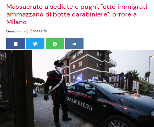 È evidente la formula dubitativa usata dall’articolista, che parla di “almeno 8-10 persone” (lo riferisce la fonte) “probabilmente straniere”. Al contrario dell’espressione, sicuramente colloquiale trattandosi di un virgolettato, usata da Libero (“lo hanno ammazzato di botte”) emerge che il carabiniere sia sopravvissuto all’aggressione.