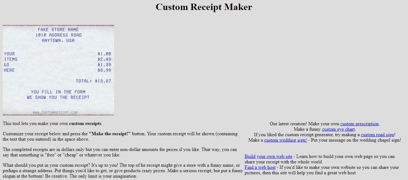 La pagina è molto intuibile e chiunque può creare il proprio scontrino fake. Se osserviamo l’esempio riportato una volta che apriamo il sito troviamo la grafica e il font identici a quelli dello scontrino preso in esame: