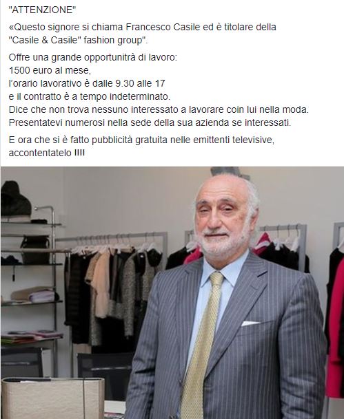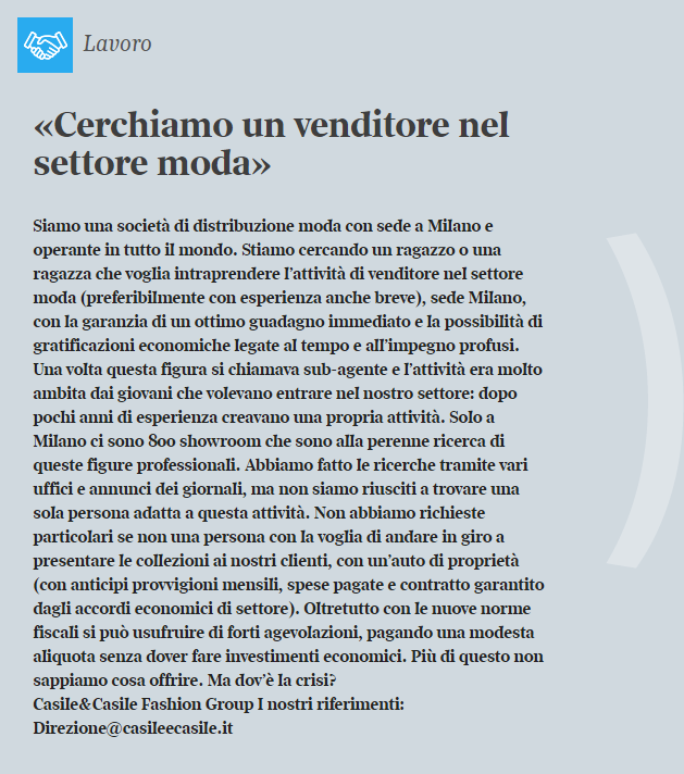 Il 17 ottobre Francesco Casile, agente di commercio del settore moda, si era rivolto al Corriere della sera con una lettera per cercare un ragazzo o una ragazza per un’attività di venditore nel settore moda con sede a Milano: