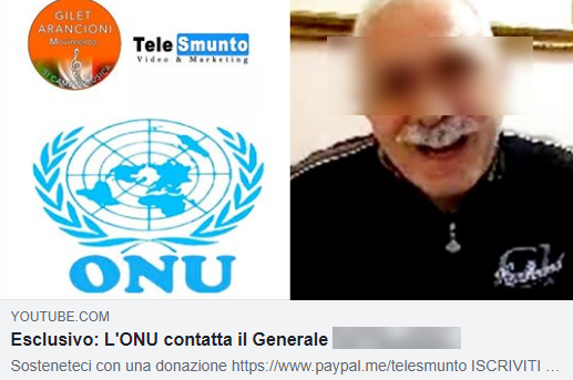Secondo un video pubblicato dal canale YouTube TeleSmunto, che i nostri lettori ci segnalano, il noto Generale P. sarebbe stato contattato dall’ONU sulla gestione dell’emergenza Coronavirus. Secondo il Generale P. alcuni rappresentanti dell’ONU lo avrebbero contattato per complimentarsi per la sua battaglia, con la partecipazione di una traduttrice per lo spagnolo, e gli avrebbero riferito che l’Italia sarebbe stata oggetto di una manipolazione che facesse apparire una pandemia come letale.