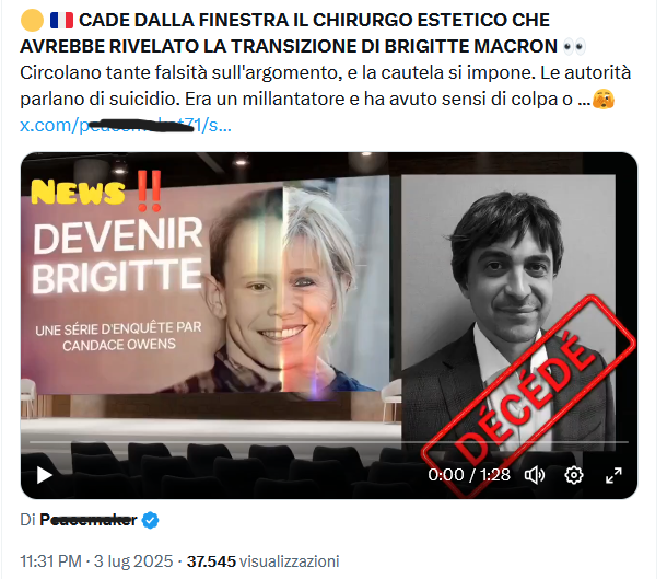 L’Operazione Doppelganger inventa il chirurgo plastico ucciso per aver scoperto che Brigitte Macron è un uomo: questo il contenuto di due post X, uno in lingua italiana ed uno in lingua inglese entrambi pubblicati da account “spunta blu”.
