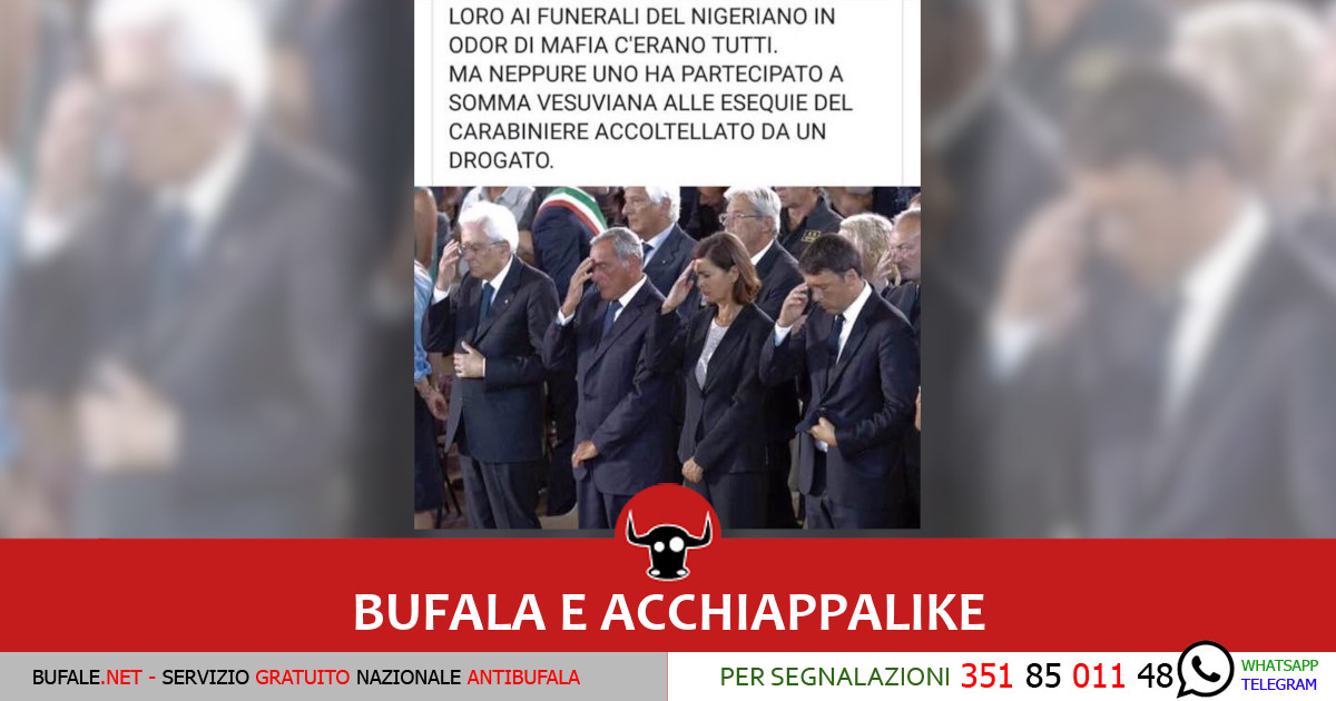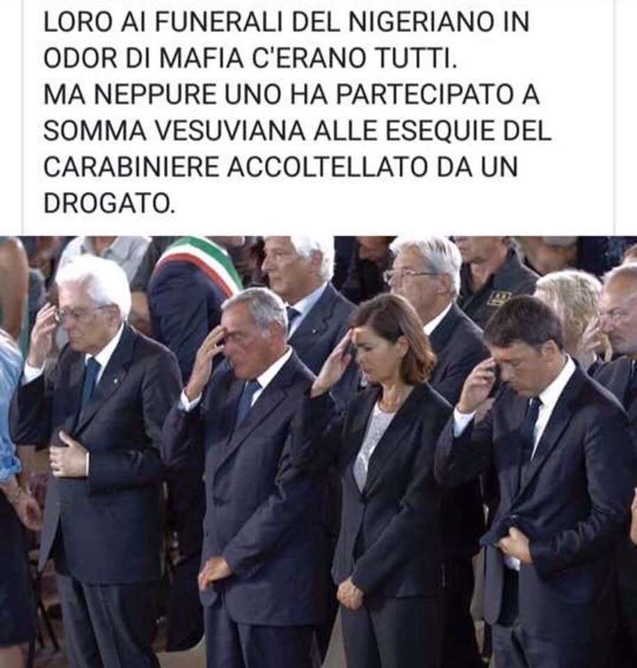 Sì, sappiamo che Laura Boldrini, Matteo Renzi e Sergio Mattarella, in questo post, sono dipinti come i “buonisti” che partecipano ai funerali del nigeriano ucciso a Fermo – ve lo specifichiamo noi, visto che chi pubblica certi post soffre di stipsi argomentativa – e non ai funerali di Mario Cerciello Rega, ma all’autore del post ricordiamo: la foto usata per screditare i politici immortalati è stata scattata durante i funerali di Ascoli del 2016, e come specificano i colleghi di Butac in quell’occasione parteciparono le forze politiche in carica, mentre al funerale del carabiniere hanno partecipato i politici attualmente in carica. Da comprendere è semplicissimo, da accettare è complicato e richiede troppa intelligenza.