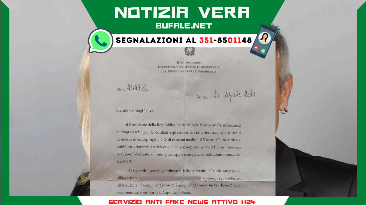 L’Ufficio di Segreteria del Presidente della Repubblica scrive ai Jalisse: ha ricevuto la loro mail in cui parlavano del loro CD creato durante il lockdown e invia un indirizzo per riceverne una copia.
