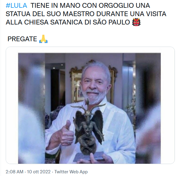Come abbiamo visto l’accusa strumentale di satanismo appare spesso nel mondo del complottismo, ma in questo caso anche nella politica. Sui social in questo periodo elettorale sono infatti apparsi video e messaggi in cui Lula viene descritto come “draconiano luciferino affine a Satana ed alle religioni Wicca”. In almeno un caso la netta replica dello staff di Lula ha costretto qualcuno di coloro che proponevano tale teoria a ritrattare pubblicamente accusando strumentalizzazione delle sue affermazioni.