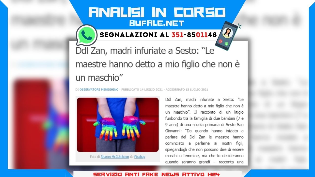Un articolo pubblicato sull’Osservatore Meneghino il il 14 luglio 2021 e che riporta una protesta di un gruppo di madri contro il ddl Zan a Sesto San Giovanni, nel milanese. L’articolo parla di una lite “inferocita” tra una famiglia con due bambini di 7 e 9 anni e una scuola primaria di Sesto San Giovanni nella quale, secondo l’articolo, le maestre avrebbero parlato agli alunni del ddl Zan creando “confusione”.