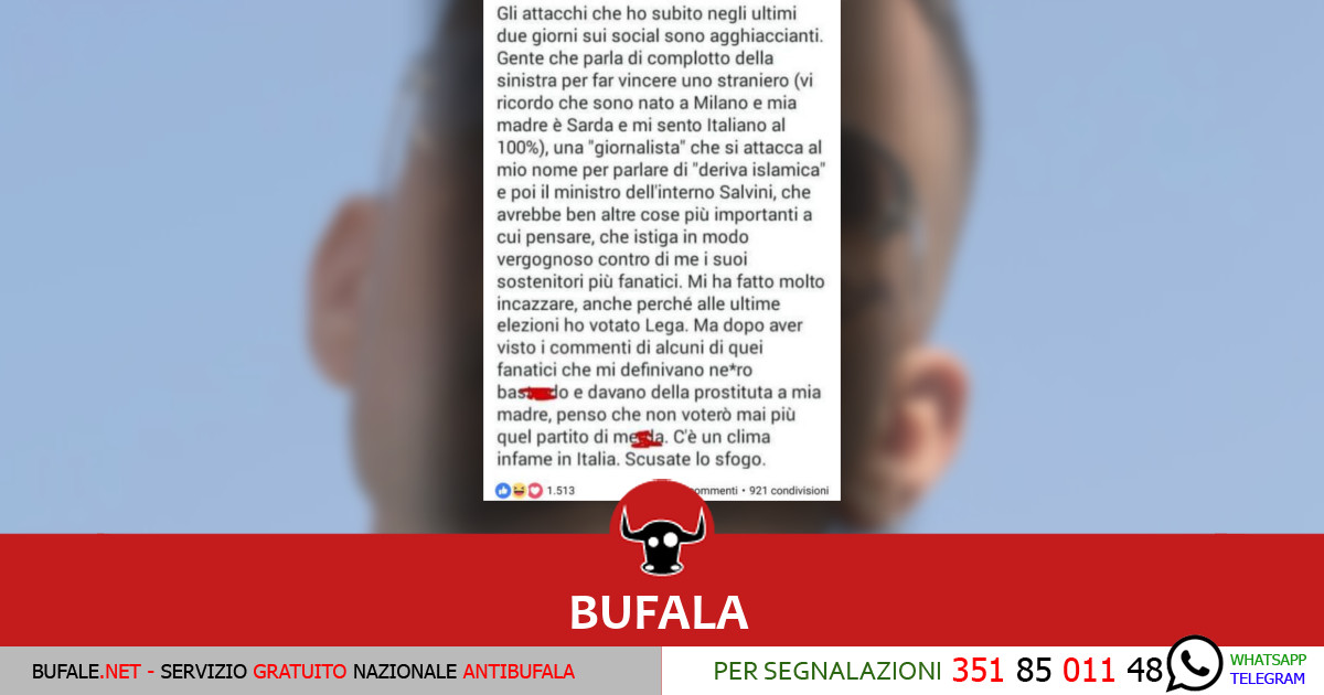 Gli attacchi che ho subito negli ultimi due giorni sui social sono agghiaccianti. Gente che parla di complotto della sinistra per far vincere uno straniero (vi ricordo che sono nato a Milano e mia madre è Sarda e mi sento italiano al 100%), una “giornalista” che si attacca al mio nome per parlare di “deriva islamica” e poi il ministro dell’interno Salvini, che avrebbe ben altre cose più importanti a cui pensare, che istiga in modo vergognoso contro di me i suoi sostenitori più fanatici. Mi ha fatto molto incazzare, anche perché alle ultime elezioni ho votato Lega. Ma dopo aver visto i commenti di alcuni di quei fanatici che mi definivano ne*ro bast**do e davano della prostituta a mia madre, penso che non voterò mai più quel partito di me**a. C’è un clima infame in Italia. Scusate lo sfogo.