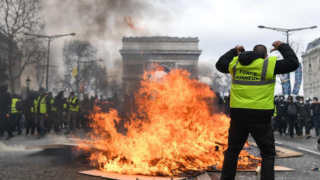 Manifestazione dei gilet gialli, vetri frantumati dai “casseurs” e rovine fumanti sugli Champs Elysées di Parigi
