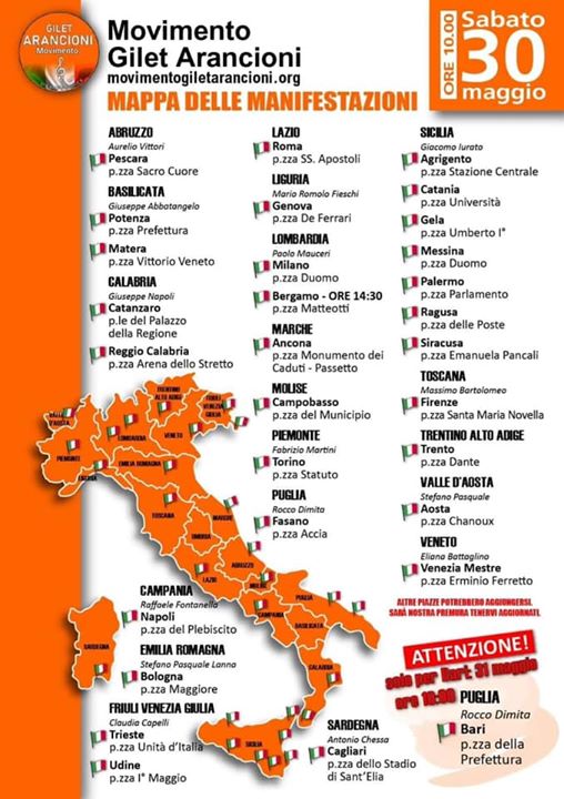 I nostri lettori ci segnalano un post in viene mostrata una locandina che annuncia una serie di manifestazioni del Movimento Gilet Arancioni con mobilitazioni il 30 e il 31 maggio nelle principali piazze d’Italia.