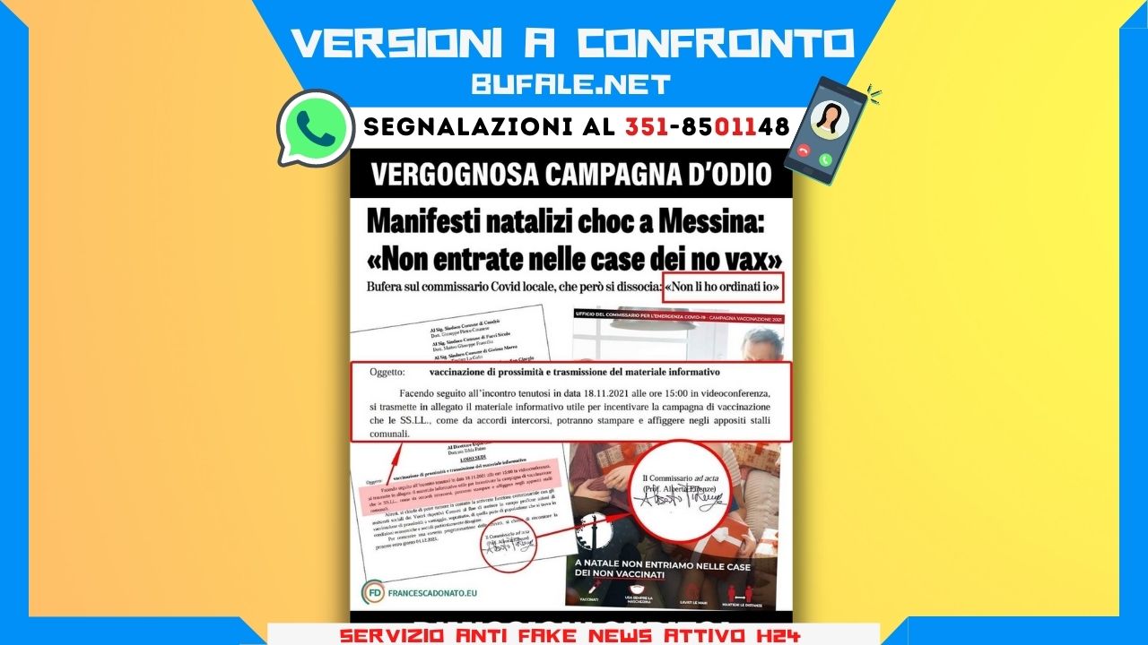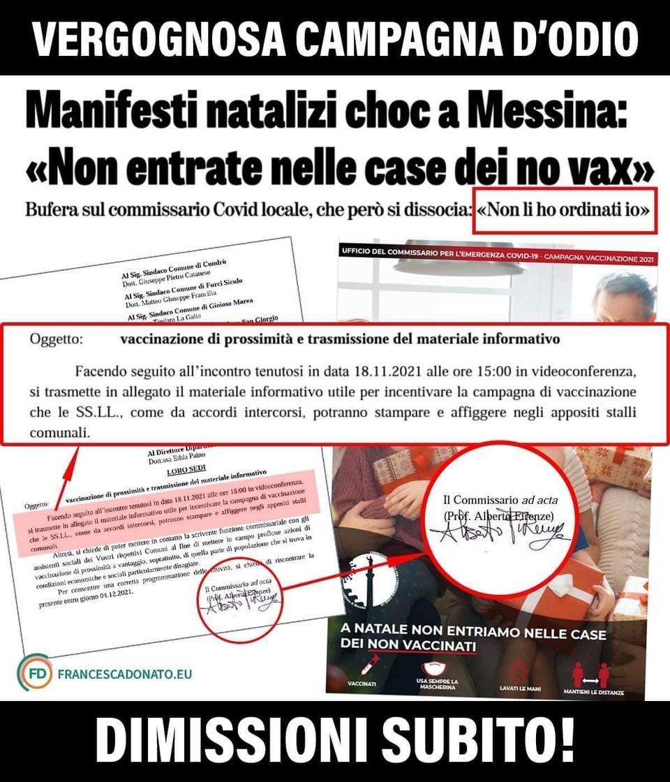 “A Natale non entriamo nelle case dei non vaccinati”, questo recitano alcuni manifesti a Messina, comparsi nei giorni scorsi e portati all’attenzione dai deputati del Movimento 5 Stelle Antonio De Luca e Valentina Zafarana, che sulle loro bacheche social hanno pubblicato una nota attribuita all’ASP di Messina e firmata dal commissario Covid ad acta Alberto Firenze. Questa nota è stata resa pubblica da Messina7 in un articolo di domenica 12 dicembre. Tra i personaggi che hanno ripreso la notizia con una certa nota di scandalo c’è anche Francesca Donato.