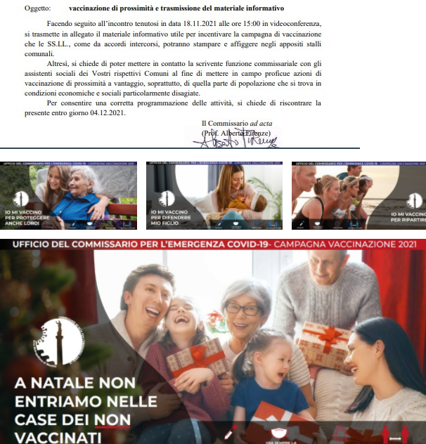 In poche parole, il commissario Covid Alberto Firenze avrebbe inviato ai sindaci questa nota per invitarli ad affiggere presso i loro Comuni il materiale in allegato. Come possiamo notare, specialmente nell’immagine finale impera il testo: “A Natale non entriamo nelle case dei non vaccinati”, con il simbolo della Madonna della Lettera la cui statua domina il porto di Messina.