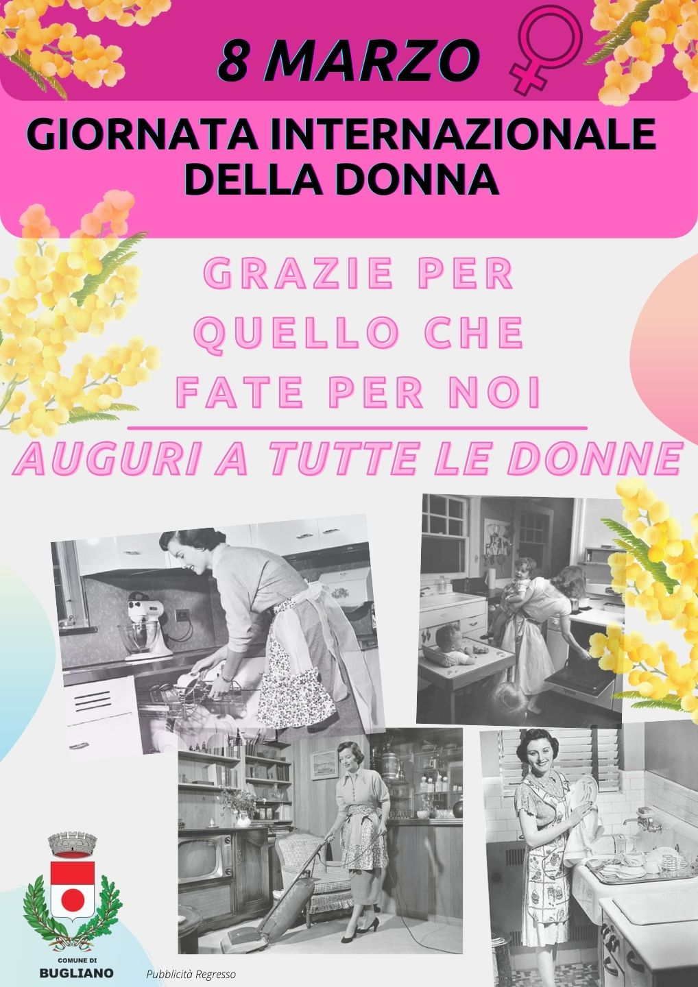 Un manifesto dell’8 marzo ha scatenato polemiche. Nel cartellone, con gli auguri e i ringraziamenti rivolti a tutte le donne “per quello che fate per noi”, vediamo scatti d’epoca con donne impegnate nelle faccende domestiche: accudire i bambini, passare l’aspirapolvere e lavare le stoviglie. Un’iniziativa riprovevole, se vogliamo, ma che arriva dalla pagina satirica del Comune immaginario di Bugliano. La fonte, tuttavia, non è sufficiente a evitare le polemiche.