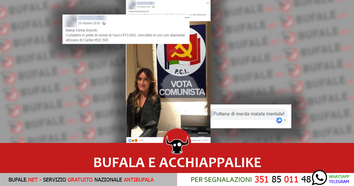 Maria Elena Boschi, oggi, ritorna all’attenzione degli odiatori seriali a odore di disinformazione e bufala con una foto pubblicata il 20 ottobre 2018 da un utente Facebook. La deputata viene mostrata accanto a un manifesto del PCI con una didascalia che ne descrive l’outfit nel dettaglio: