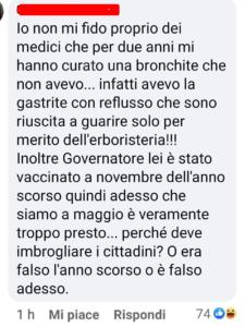 Il post del Presidente Fedriga è stato immediatamente preso di mira da un’orda di no-vax agguerriti, che hanno riempito la sezione commenti con le solite teorie deliranti sul “siero sperimentale”. Alcuni hanno anche insinuato che la vaccinazione di Fedriga sia stata in realtà solo una messinscena. Altri lo hanno pure insultato. I no-vax non riescono proprio a darsi pace: contro ogni evidenza stanno negando l’efficacia dei vaccini, e magari sarà proprio per questo che sono nervosetti. Ecco una carrellata di commenti tratti dal post in questione.