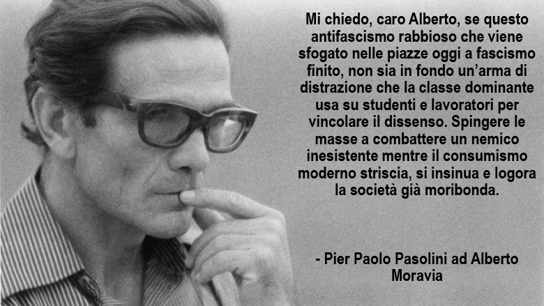 Da una lettura del corpus Pasoliniano inoltre non si evince mai, in una singola riga, una critica contro un presunto “antifascismo”, bensì una teoria per cui