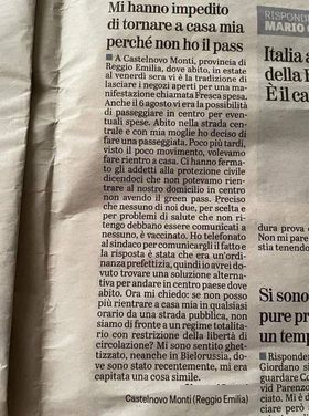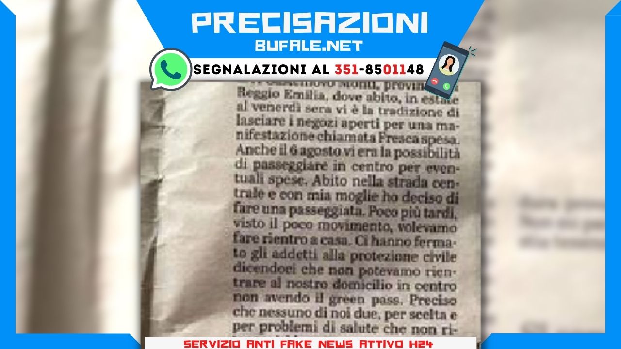 Sui social sta circolando il ritaglio di un giornale che riporta la lettera di un cittadino di Castelnovo ne’ Monti (Reggio Emilia) che riporta un episodio vissuto da lui stesso e dalla moglie. Il lettore, G.B., spiega che nella serata di venerdì 6 agosto, data dell’entrata in vigore del Green Pass, si trovava a passeggiare con sua moglie in occasione della manifestazione Fresca Spesa, che si tiene ogni venerdì dell’estate e consente l’apertura dei negozi nelle fasce notturne. G.B. e sua moglie, che abitano al centro del paese, avevano dunque deciso di rientrare a casa ma la Protezione Civile avrebbe impedito loro l’accesso in quanto sprovvisti di certificazione verde. A quel punto G.B. avrebbe chiamato il sindaco Enrico Bini per spiegare la faccenda, e il primo cittadino gli avrebbe consigliato una soluzione alternativa per fare rientro a casa.