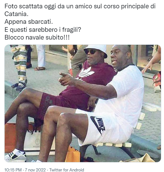 I nostri lettori ci fanno notare che in un tweet viene mostrata la foto di due uomini seduti su una panchina, entrambi con i brand ben visibili sui loro indumenti e dall’aspetto tutt’altro che provato dalla traversata.