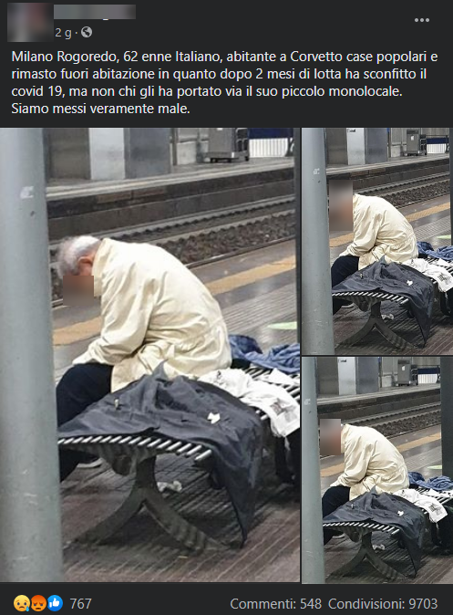 A più riprese ci è stato segnalato un post in cui si narra la storia di un 62enne italiano, fotografato su una panchina della stazione di Milano Rogoredo, che si sarebbe ritrovato senza casa dopo aver lottato per due mesi contro il COVID-19. Secondo il post l’uomo, indicato come residente a Corvetto, non può ritornare nel suo monolocale in quanto quest’ultimo risulterebbe occupato da abusivi.