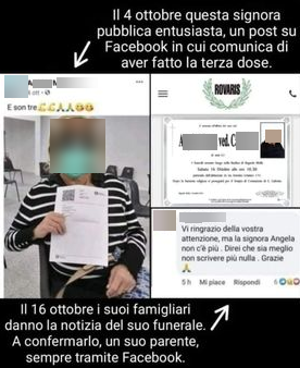Alcuni si pongono il quesito se la signora soffrisse di qualche patologia, ma non è dato saperlo. Ciò che manca alla narrazione, in sostanza, sono dati oggettivi, che di certo non vengono forniti dai commenti in cui viene forzata la correlazione tra la morte della signora e la terza dose del vaccino. Il post del 4 ottobre, ovvero quello in cui A.M. avrebbe dichiarato la terza dose ricevuta, è sparito.