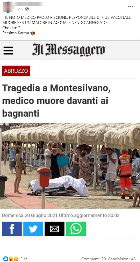 Non si è fatto in tempo a metabolizzare la morte di Paolo Piscione quando nelle ore successive, da un profilo Facebook ad alto contenuto complottista, no-vax e tossico, è scattata l’ironia. Sul profilo di E. F., alle 6:27 di oggi 21 giugno, è comparso lo screenshot dell’articolo del Messaggero con tanto di didascalia: “Pessimo Karma”. Il post è ancora online.