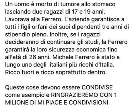 La storia è vera e ce ne eravamo già occupati nel 2016. Stiamo parlando del sistema di Welfare aziendale riportato anche da Repubblica. Un dipendente del cuneese – al centro del post che andiamo ad analizzare – era morto per un tumore allo stomaco e aveva lasciato due figli, uno di 17 anni e l’altro di 19. Un vicino di casa, su Facebook, aveva raccontato che l’azienda aveva pagato alla famiglia gli stipendi per i tre anni successivi, e qualora i figli avessero deciso di continuare gli studi, la Ferrero avrebbe garantito loro una sicurezza economica fino ai 26 anni.