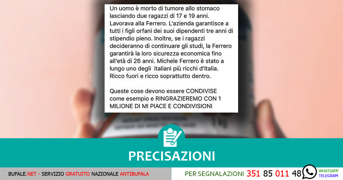 Un post virale riporta il caso di un dipendente della Ferrero: l’azienda, dopo la sua morte a causa di un tumore, si è fatta carico delle spese per i suoi due figli: