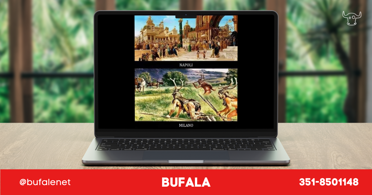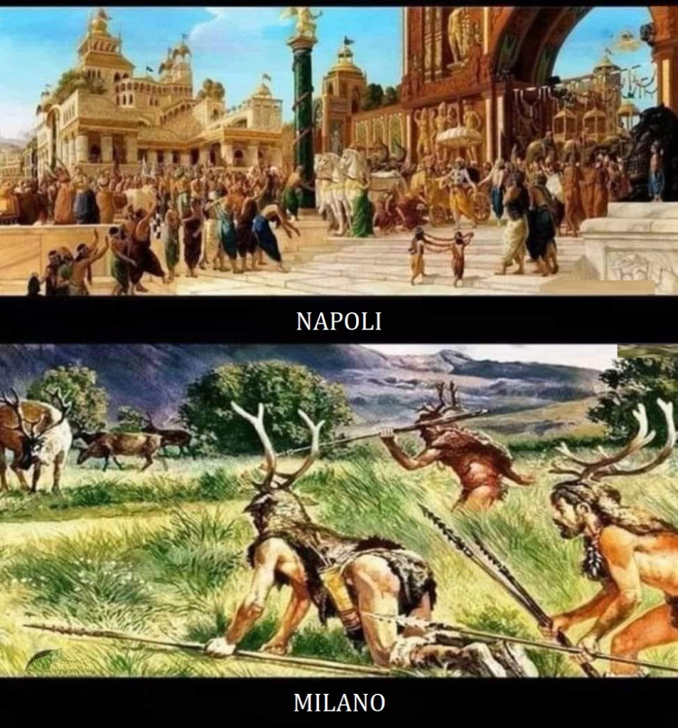 Ci segnalano i nostri contatti una immagine macro che presenta Napoli e Milano nell’antichità. Ovviamente, Napoli è rappresentata dall’immagine di una antichissima metropoli nobilissima e piena di personaggi in ricche vesti, Milano come una posa di due barbari a caccia.