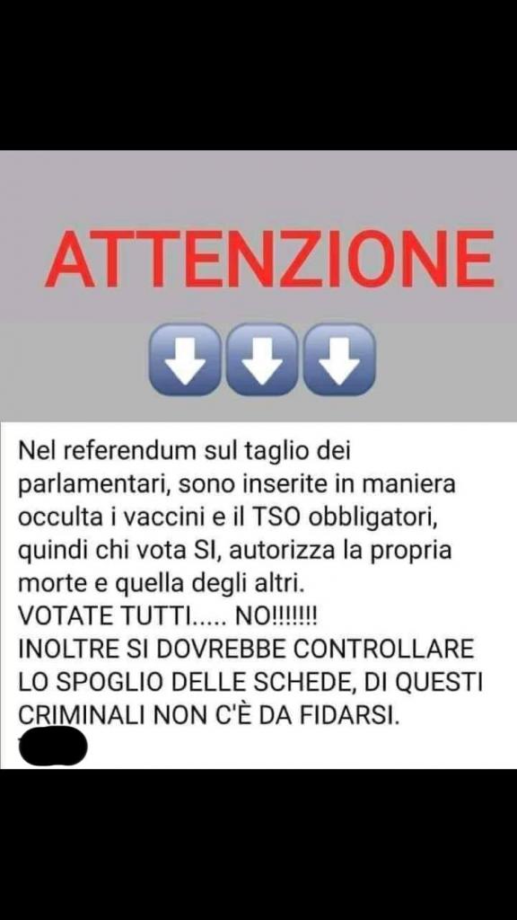 Ci segnalano i nostri contatti una condivisione virale dal titolo “nel Referendum sul taglio dei parlamentari sono inserite in maniera occulta i vaccini e il TSO obbligatori (sic!) “.