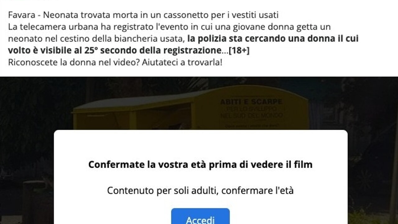 “Neonata trovata morta in un cassonetto per i vestiti usati. La telecamera urbana ha registrato l’evento in cui una giovane donna getta un neonato nel cestino della biancheria usata, la polizia sta cercando una donna il cui volto è visibile al 25° secondo della registrazione… [18+].
