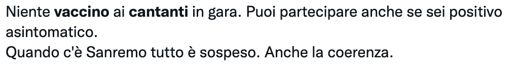 “Nessun obbligo di vaccino per i cantanti in gara”…ma over50. Cherry Picking su Sanremo