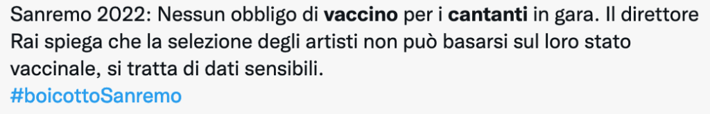 “Nessun obbligo di vaccino per i cantanti in gara”: questo l’allarme rilanciato da due giorni dalla bolla social novax.