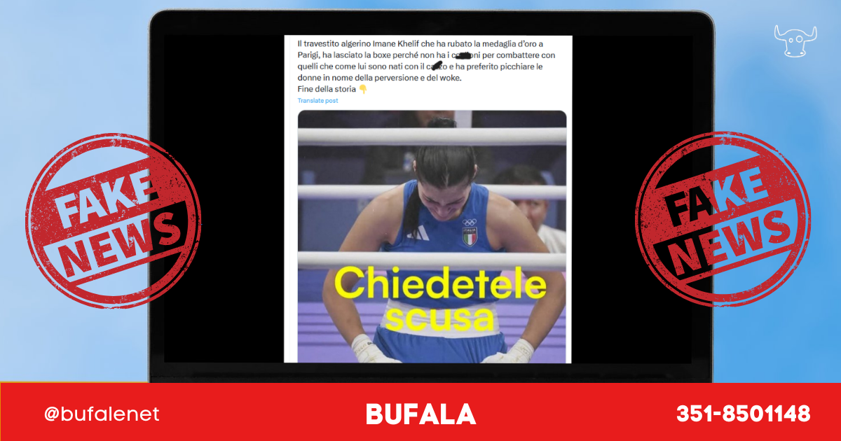 Notizia diffusa da post spesso con epiteti volgari e ingiuriosi verso la campionessa che incitano il lettore a rivolgerle ingiurie di stampo omotransfobicon la “scusa di chiedere scusa” ad Angela Carini, atleta il cui ritiro in un match contro la Khelif fu lungamente strumentalizzato per diffondere la narrativa (cavalcata dall’IBA, federazione connessa al Cremlino e interessata a gettare ombra sui giochi olimici di Parigi) di “Imane Khelif uomo bullo e cattivo a cui i Poteri Forti consentono di usare violenza contro le donne”.