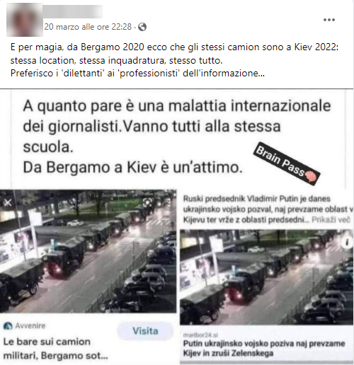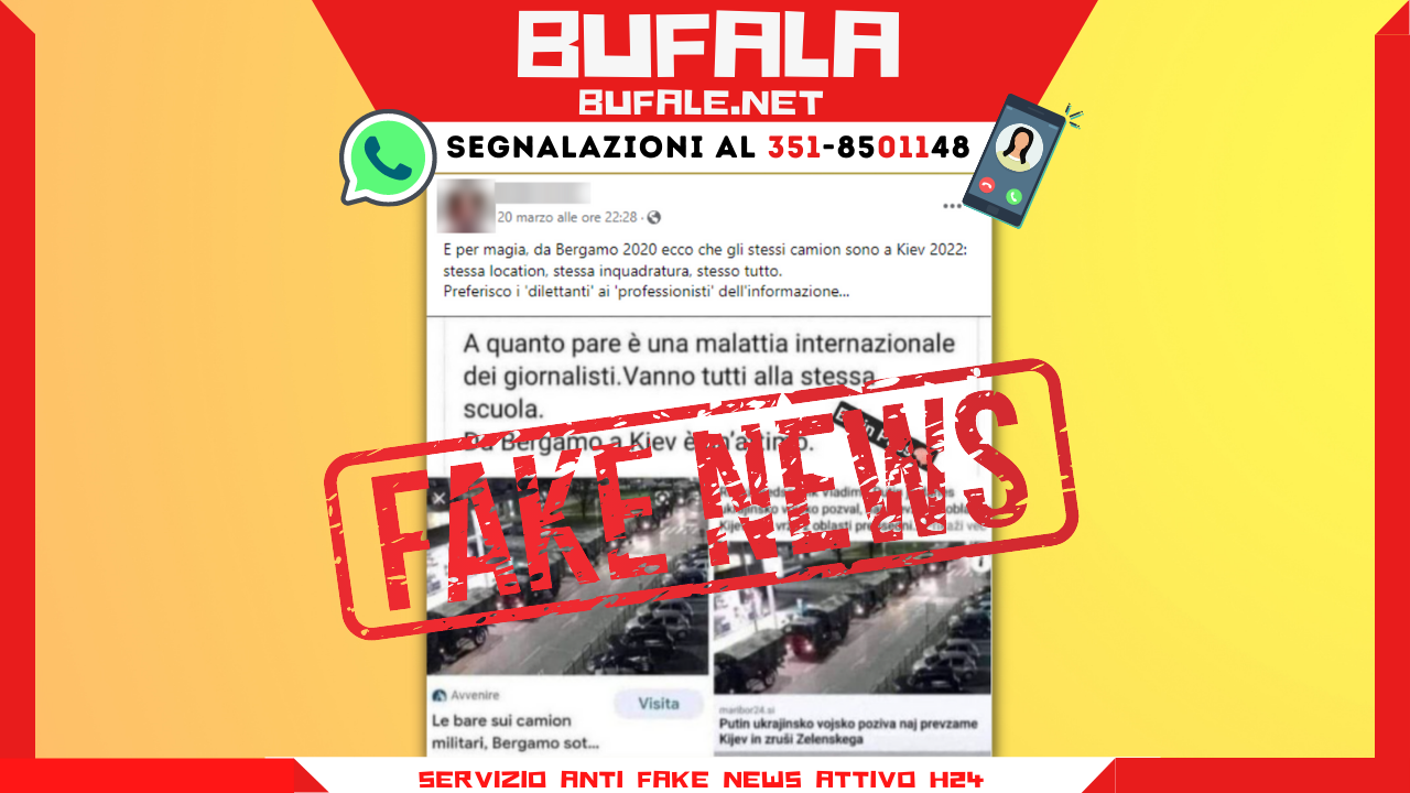 Le foto dei camion che trasportavano le bare di Bergamo sono ancora l’ossessione dei negazionisti che, fino ad almeno 10 anni fa, restavano coloro che negavano l’Olocausto. Dall’inizio della pandemia abbiamo conosciuto quelli che negavano l’esistenza di un’emergenza globale; da febbraio, quando Putin ha fatto partire la sua avanzata contro l’Ucraina, sono arrivati quelli che pur di fronte alle immagini delle devastazioni, delle vittime e dei grandi esodi, si sono convinti che fosse tutta una messinscena. Oggi i nostri lettori ci segnalano il crossover: secondo un post pubblicato il 20 marzo, i giornalisti starebbero usando le foto delle bare di Bergamo per documentare quanto sta accadendo a Kiev.