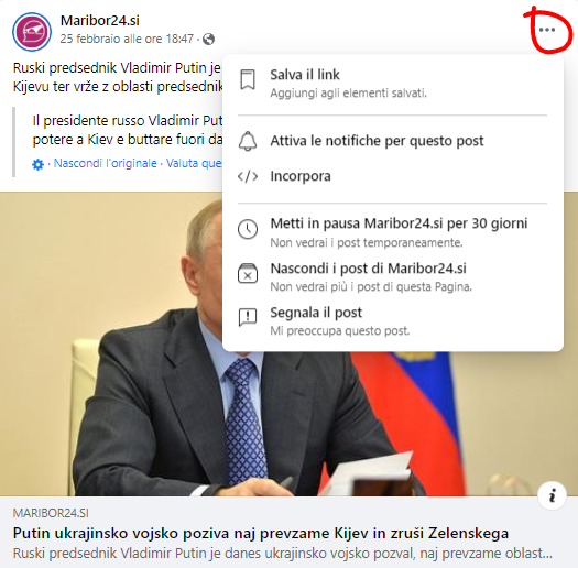 Non basta, ovviamente. Chi scrive sul web sa molto bene che è possibile impostare immagini diverse per il sito web e per i social. Andiamo quindi sulla pagina Facebook di Maribor24 e troviamo il post incriminato il 25 febbraio 2022. L’immagine dell’anteprima mostra, ancora una volta, Vladimir Putin e non i camion militari che transitavano a Bergamo nel 2020. Non basta, perché gli admin potrebbero aver modificato il post tramite lo strumento di debug. Facebook, tuttavia, permette di visionare lo storico delle modifiche di un post. È sufficiente cliccare sui 3 puntini in alto a destra e selezionare la voce “visualizza cronologia modifiche”. Quando questa voce non c’è, significa che il post non è mia stato modificato. Tale voce, nel post di Maribor24, è assente.