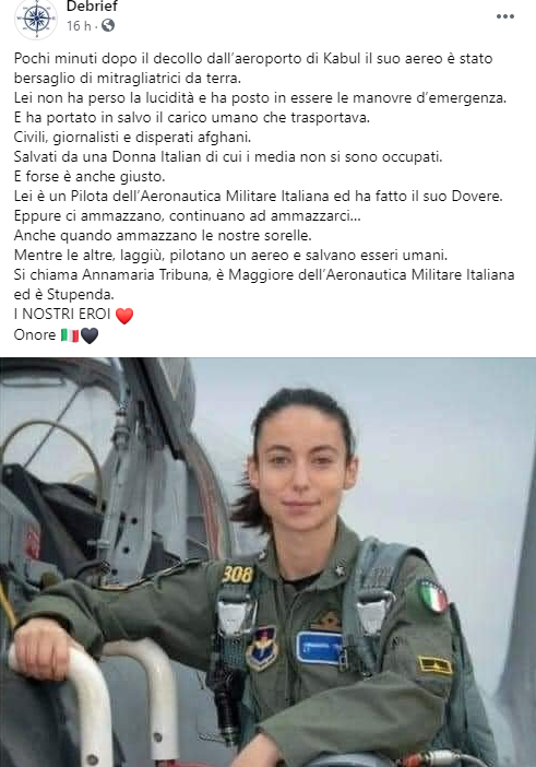 Questa mattina gli admin hanno pubblicato la foto di Annamaria Tribuna, maggiore dell’Aeronautica Militare e pilota del C-130J spedito in Afghanistan per l’operazione Aquila Omnia con l’obiettivo di trarre in salvo italiani e afgani in fuga dai talebani.