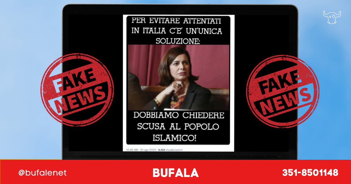 Ci segnalano i nostri contatti un post X contentente una card che raffigura Laura Boldrini che ordina di chiedere scusa al popolo islamico per evitare attentati.