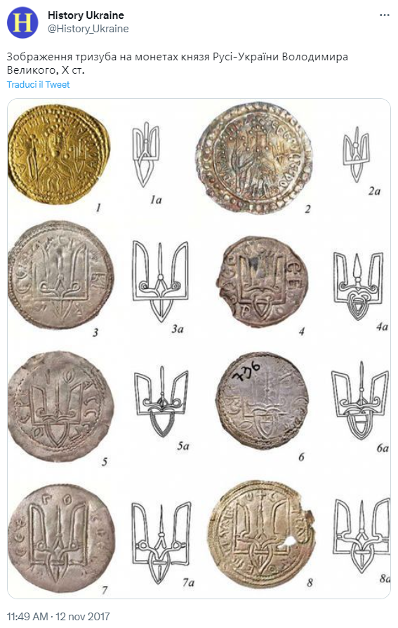 Il simbolo riportato sulla maglietta di Zelensky è una delle varianti del Tridente Ucraino, simbolo dell’entità che sarebbe diventata l’Ucraina dai tempi del Rus di Kiev, o quantomeno dai tempi di Vladimiro il Grande (900 circa d.C.).