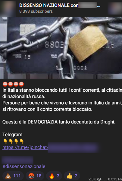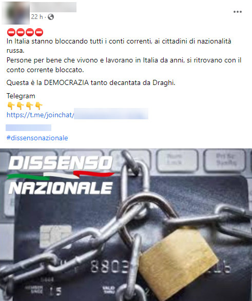 Come si evince dal post, chi pubblica questa informazione fa parte del movimento Dissenso Nazionale, che si pone in una posizione di sentito antagonismo al governo in carica. L’autore del post afferma che i cittadini di nazionalità russa che vivono in Italia starebbero subendo un blocco dei conti correnti a seguito del conflitto. Per questo motivo l’autore deride il concetto di “democrazia” del governo Draghi, non ben specificando quale attinenza abbia con il suo discorso.