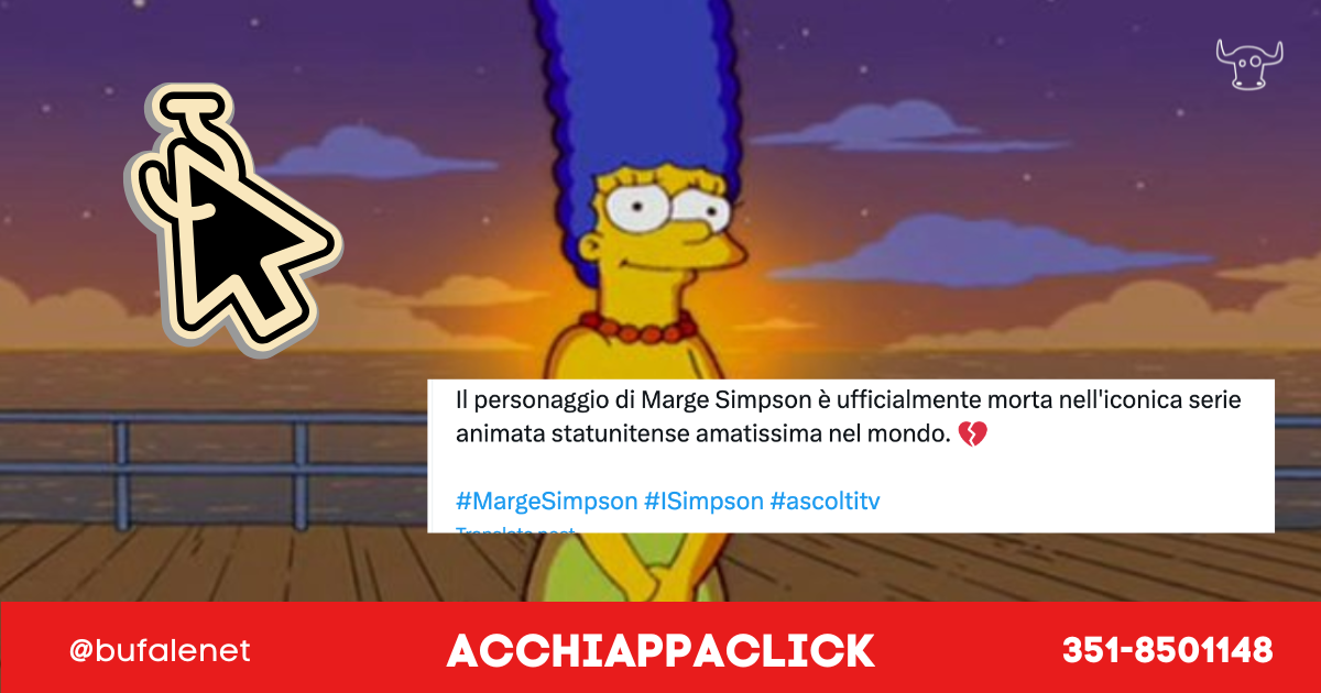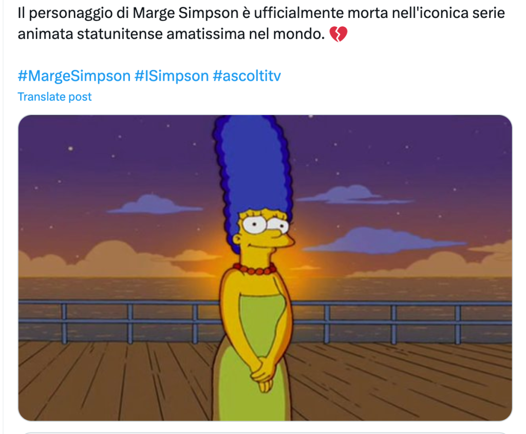 Ci segnalano i nostri contatti un post X, evidententemente clickbait, secondo cui è “ufficialmente morta Marge Simpson”. L’episodio fa riferimento al pluriviralizzato dalla stampa finale della 38ma stagione “Estranger Things” (gioco di parole tra la serie TV “Stranger Things” e “Robe da separati”).